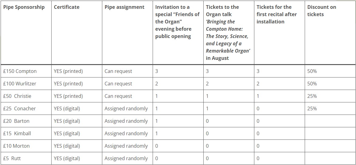 The sponsorship levels reflect the scale of the instrument, with contributions ranging according to pipe size — the larger, more prominent pipes representing the highest sponsorship tier, and the smaller pipes available at lower levels. This structure allows supporters to select a meaningful option while contributing to the restoration and preservation of the organ.